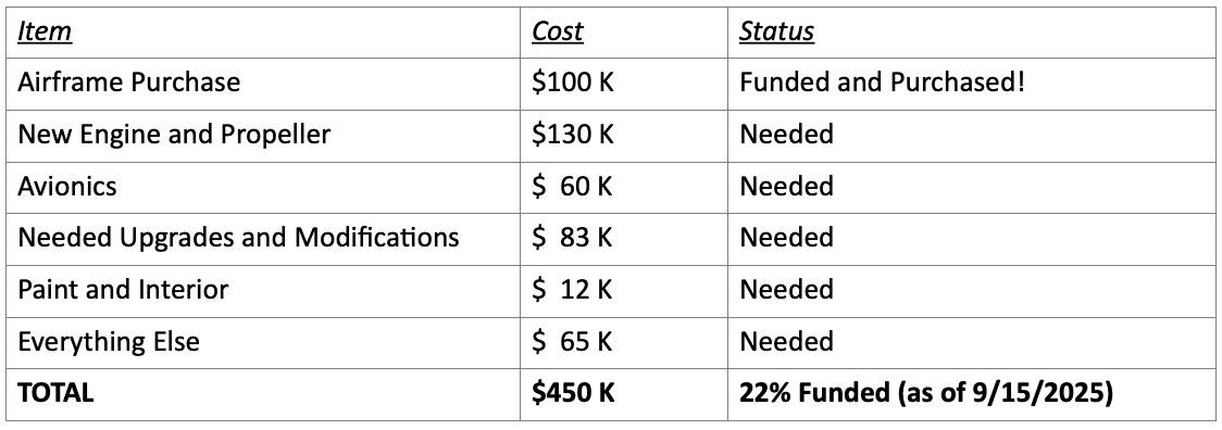 This is estimated to be a $450,000 project. The first $100,000 has already been raised and used to purchase a great used Cessna 206 (G model) airframe. Here’s the breakdown: